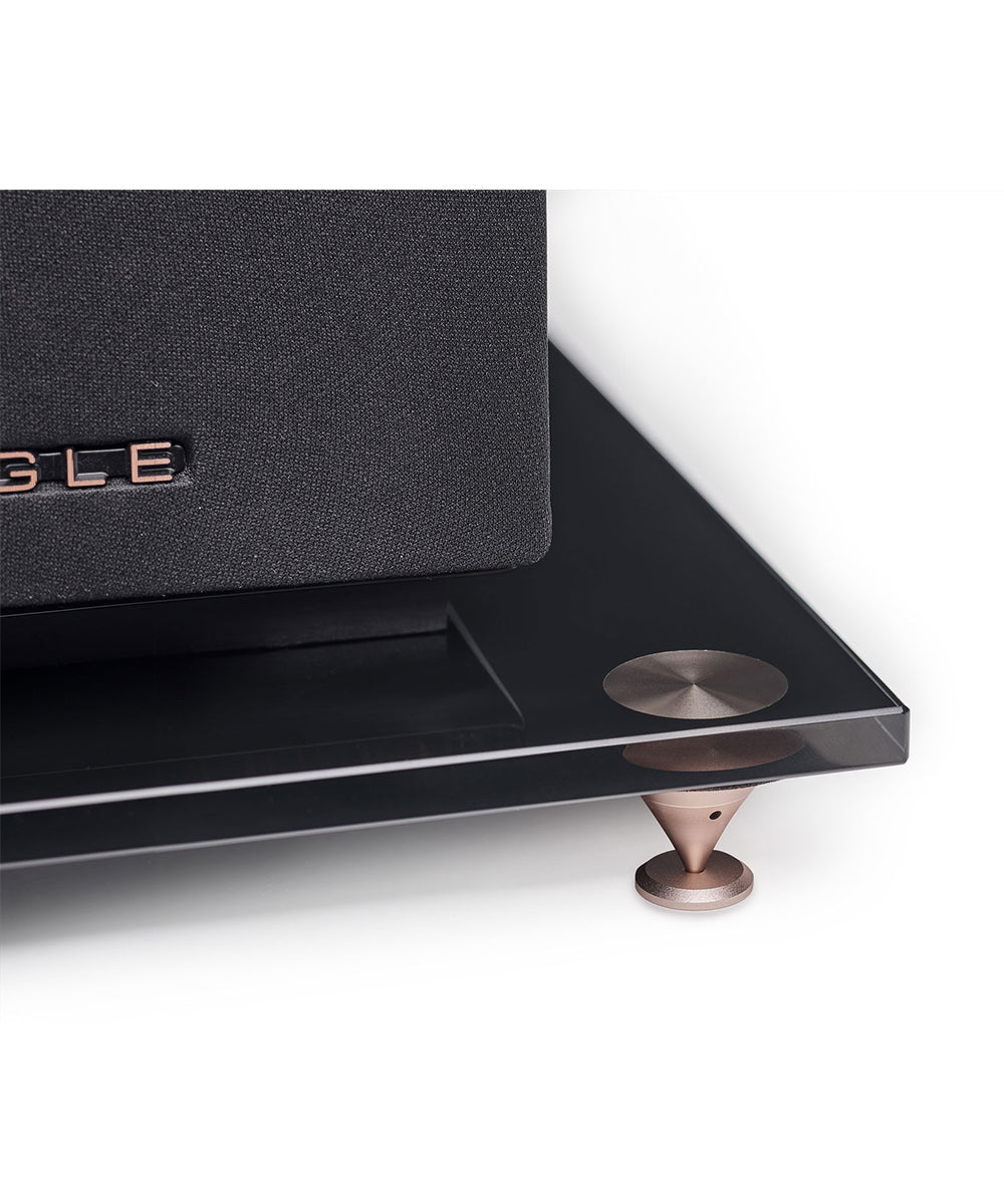 Two sets of decoupling spikes: the first one in rose gold aluminum, adjustable in height and provided with lock nuts for surfaces like carpets, and the second one in rubber for more rigid surfaces.